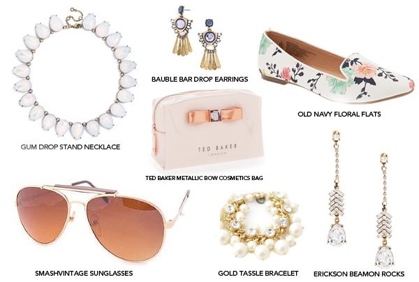 Bauble Bar Gum Drop Stand Necklace $48 | Bauble Bar Drop Earrings $32 | Ted Baker Metallic Bow Cosmetics Case $45 | Old Navy Floral Flats $25 | Smash Vintage Sunglasses $25 | Accessory Concierge Pearl Bracelet $15 | Erickson Beamon Rocks Earrings $28