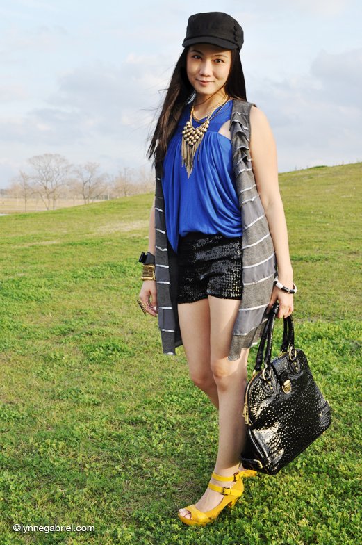 Added a black bow leatherette bracelet and gold and black cuff bangle which are both very trendy. Gold goes really well with royal blue. This picture also gives you a closer view of my shorts. As you can see, it’s heavily sequined. Pretty neat!