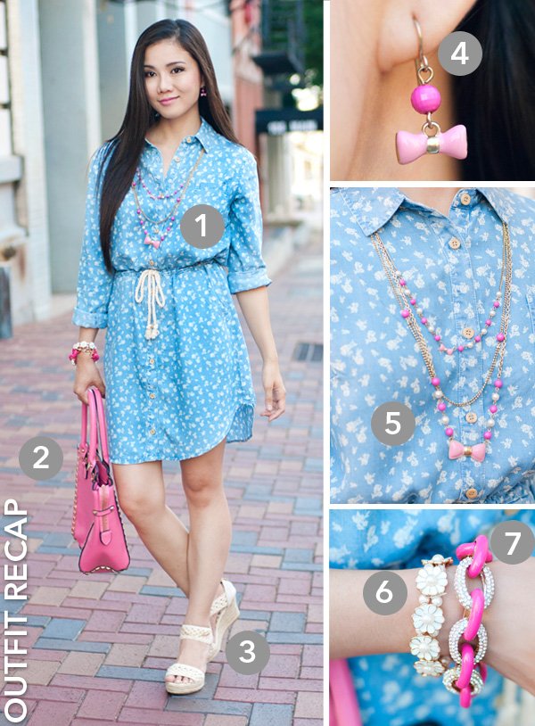 1. Velvet Heart Printed Chambray Shirt Dress | 2. AMI Clubwear Handbag | 3. Deb Shops Crochet Espadrille Wedges | 4. & 5. Charming Charlie Necklace and Earrings Set | 6. Chicwish Daisy Bracelet | 7. Our World Boutique Bracelet (All c/o)