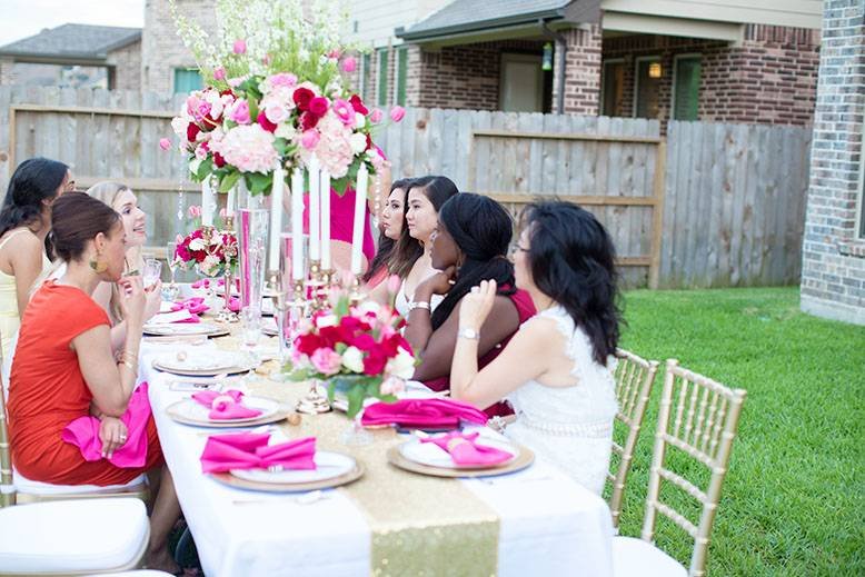 Setting the atmosphere doesn’t just end in flowers though. It’s adding the nice little touches here and there such as the way you have the napkin folded, the personalized place cards, the charger plates, the gold chiavarri chairs (rented from Elle Event Rentals), the table linens, and so on. A table set-up normally includes a charger plate, silverware, napkins and drink ware. A lot of times, it’s more cost-effective to purchase them than rent them. Another advantage of this is that you’d be able to re-use them for another event. Amazon has wonderful selection of acrylic charger plates at affordable prices. Since this particular bridal shower was Kate Spade-inspired, I decided to make bow napkins which was fairly easy to do. I purchased these fuchsia linen napkins and faux rhinestone napkin rings from Amazon for the bow napkins. I also contracted a local calligrapher, Calligraphy by Patricia, to write the place cards. Calligraphy adds a really luxurious touch to the details.