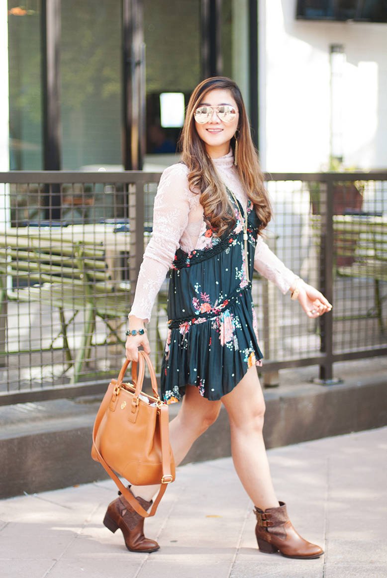 Free People Dress | Free People Lace Turtle Neck Top | Charming Charlie Aviator Sunglasses | Similar Tahari Tassel Earrings | Similar Tassel Necklace | Similar Tory Burch Handbag | CAT Footwear Willa Tweed Boots | Anne Klein Women’s Diamond Accent Watch