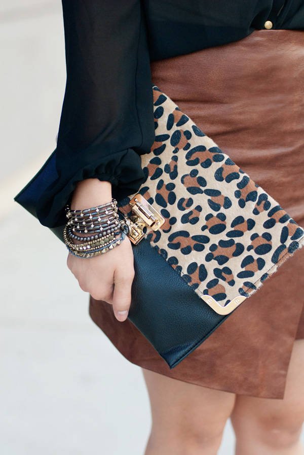 Forever21 Studded Top | H&M Faux Leather Skirt (Check out other options below.) | Deb Shops Leopard Clutch Bag (Check out other options below.) | Fergalicious by Fergie via Famous Footwear | Fibi and Clo Earrings | Boutique Minimaliste Necklace | Fibi and Clo Bracelets (All c/o)