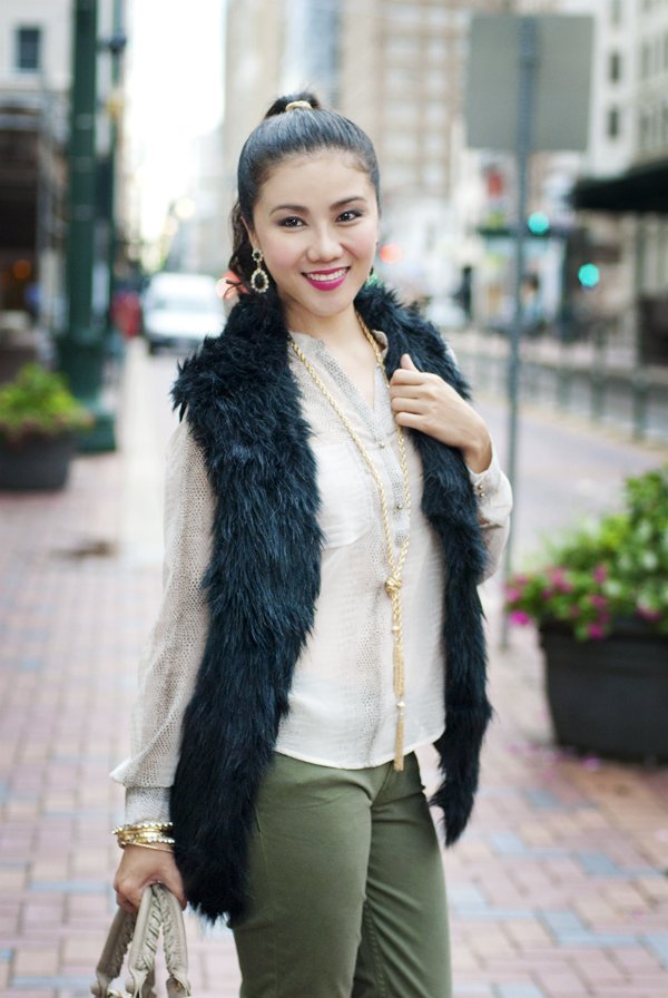 I decided to match and accessorize the jeans with two more fall trends which are fur and animal prints. The army jeans is a hard look but the key is to soften it by wearing sheer animal print top and of course the pumps and the fur add a feminine touch. What do you think?