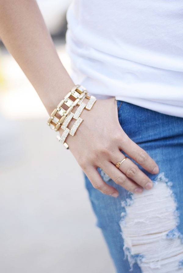 Chic Life T-Shirt | Celebrity Pink Jeans (Similar here, here, here, and here) | Tory Burch Tote Bag (Other similar here, here, and here) | J. Crew Elsie Suede Pumps (Sold out but here's a different style in the same color)(Similar here in other colors) | Sunglasses Shop Raybans (Exact one here) | Benevolent Jewel Earrings (They shut down.) | J.Crew Stretch Bracelet | Chain LInk Bracelet (Similar here and here) (All c/o except bag)