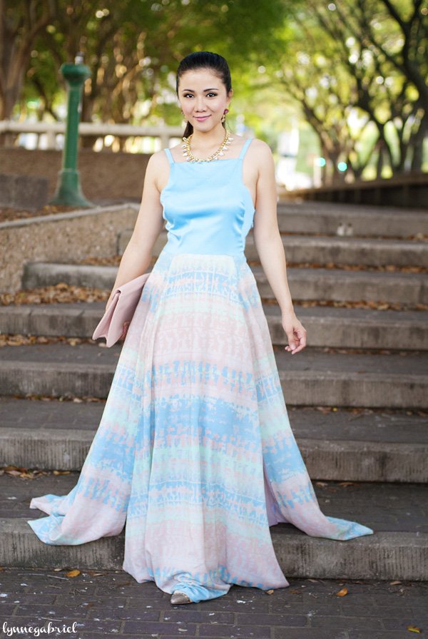 Now, on to the outfit. this maxi dress is not just your regular maxi, as you can probably tell. It's a designer maxi by Jessica Faulkner. There's something about it that makes you feel beautiful…it helps you pull out whatever beauty you have inside and radiate it on the outside. I don't know if it's the pastel colors, the thigh high slits or the amazing flow but there's something about it that will make you feel and look oh so lovely! It's quite whimsical! The only issue I usually have with maxis is the length because I am only 5'3". Other than that, this dress is gorgeous! Obviously, it's not a maxi you'd wear to travel or go to the beach. If you have a wedding to go to anytime soon, you might want to check out it out!