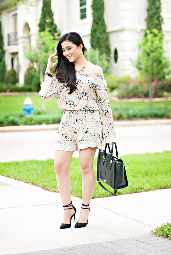 Xhilaration Off-The-Shoulder Romper (Sold out but similar here) | Similar Earrings via Amazon.com | J.Crew Necklace (Similar here, here, and here from Amazon.com) | Bracelets 1, 2, 3 from Amazon.com | Dolce Vita Handbag | JustFab Ankle Strap Pumps (All c/o except romper)