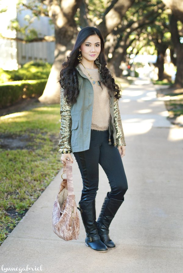 Deb Shops Military Jacket with Sequin Sleeves | Romwe Sweater | Deb Shops Leggings with Leather Trimmings | Fuss Boutique Hobo Bag | Courtney Kaye Earrings | Fibi and Clo Necklace | SM Accessories Spike Bracelets (All c/o) . . . . . . . . . . . . . . . . . . . . . . . . . . . . . . . . . . . . . ...