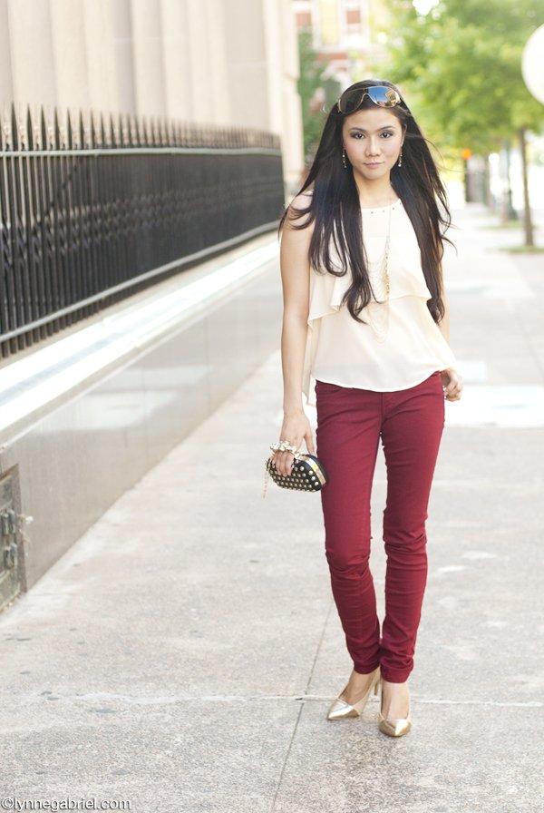 1. Marshall's Top | 2. GJG Denim | 3. JustFab Gold Heels | 4. PRADA Sunglasses via Simply Eyeglasses | 5. Outrage Fashion Necklace | 6. WeWood Watch | 7. Love Bangle from Outrage Fashion, Arrow Bangle from Stella & Dot | 8. Marshall's Studded Clutch . . . . . . . . . . . . . . . . ...