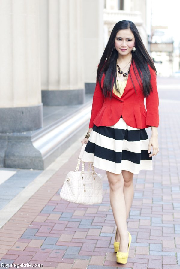 The red flare blazer and the stripes skater skirt are items I found from a wonderful online store, Tailor and Stylist, which carries chic and fab items from clothes to shoes and accessories. Not only that, I am super pleased with the way they handle customer service. Grace, the owner of the store, is one of the friendliest persons I have ever worked with! They ship super fast that the items made their way to me a few days after I have finalized my selection. Their online system ordering is very efficient.