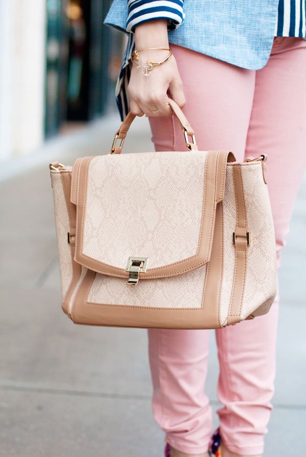 1. CAbi Chambray Jacket | 2. CAbi Bengal Stripe Tee | 3. CAbi Nectar Skinny Jean | 4. JustFab Satchel (Also check out other options below) | 5. ShoeDazzle Floral Pumps (Also check out other options below)| 6. Little Nook Boutique Earrings| 7. Necklace (Forgot where this was from but similar here in different color) | 8. Alex & Dani Bangle, Stella & Dot Arrow Bangle, Arm Candy Fashion Anchor Bangle (All c/o)