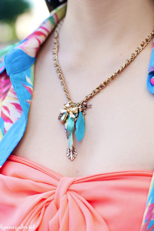 Today is another combination of bright colors. I love this tropical print button down top from Lovers and Friends. It’s from an older collection and I don’t believe it’s still available but if I’m not mistaken, they have it in dress also. While I was preparing the outfit for shoot, I was thinking of not just wearing it as is with a skirt or a pair of jeans. Then I found a bow tube top from Ooh La La Boutiques in neon coral which I have never worn yet and it just happen to match almost exactly with the neon coral part of my skirt from Wild Souls Boutique. Again, it’s not available in neon coral anymore but it’s available in neon pink. Come summer, I’m sure there will be plenty of bow tube tops once again everywhere. This is just an idea to make your look unique. By putting together pieces this way every once in awhile, you will make each item look like they are not easily available anywhere. I challenge you to try this with any existing pieces you already have at home. Be free to be creative and playful sometimes.