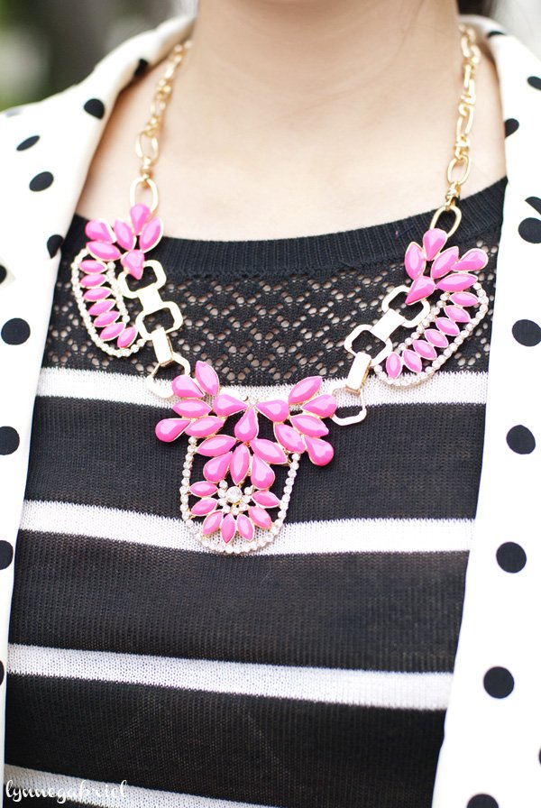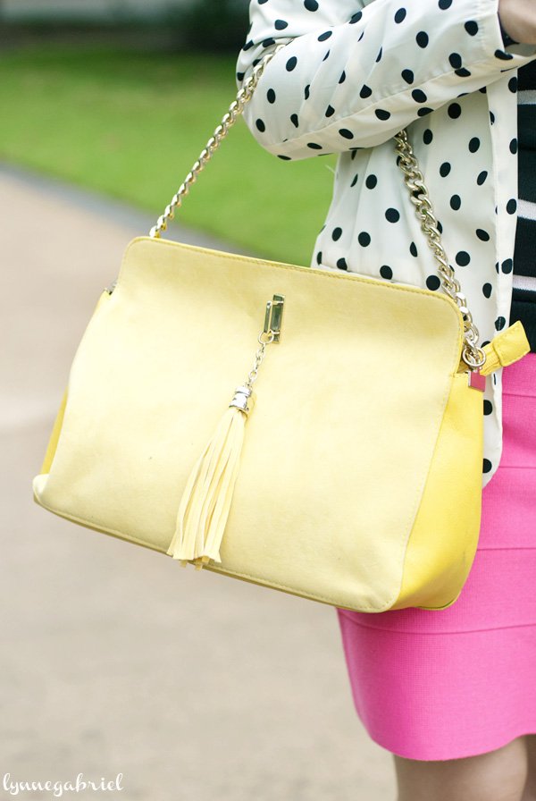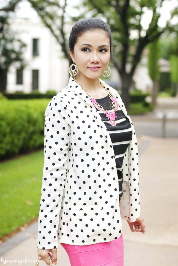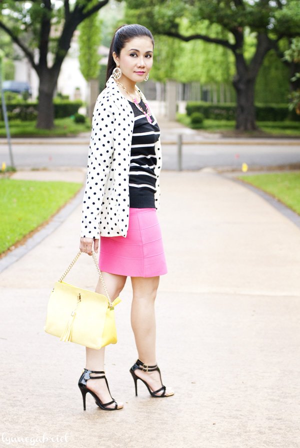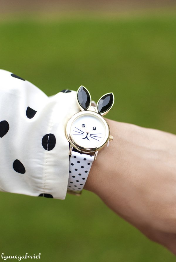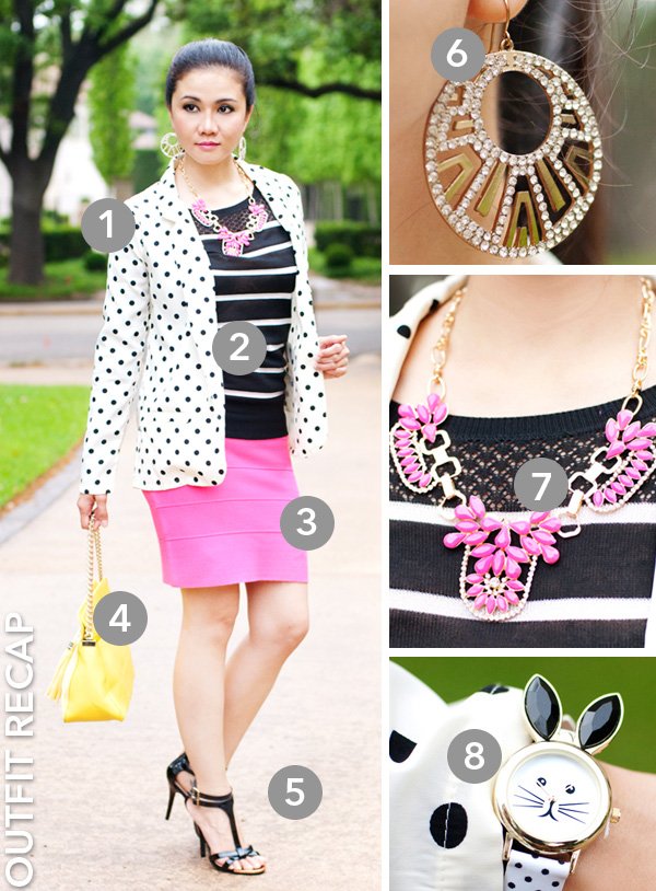 Can’t decide between polka dots and stripes? No problem! Wear them both! Yup, when you do that, they call that “coordinates” in fashion. Probably one of the terms I learned in our made-to-order business while I was growing up. I think that if for whatever reason I end up working in the corporate world, I would totally be shocking my boss and my co-workers everyday with the colors and patterns that I will be wearing to work. That will either inspire them to catch up with my fashion or fire me. Ha! Anyway, I know that many of you are working gals and you’re looking for some work-friendly outfit inspiration. Today’s outfit is a mixture of patterns with pops of color here and there. For some, this might be a little too much going on but for those of you who think this is fun, it totally is! Mixing polka dots and stripes isn’t unusual at all. For as long as I’ve known fashion, I know that this is widely used. I don’t believe you can find polka dots blazer or jacket very often but thankfully Jane.com had this in one of their deals (link above). On this post, I also showed you how you can easily transition the look from work to play, with as simple as removing the jacket! I didn’t change my handbag here but in case you’re transitioning to a night look from work, instead of having a bright handbag, you can use a black clutch or something. I totally love the versatility of these pieces from Poof Apparel. Oh did you notice my bright yellow handbag? Hard not to huh! It’s from Galian Handbags and I really recommend them. Check out the bunny watch from Charming Charlie too! Isn’t that the cutest thing ever? I promise I can be like a child sometimes! But who doesn’t want a bunny watch anyways? *Wink*